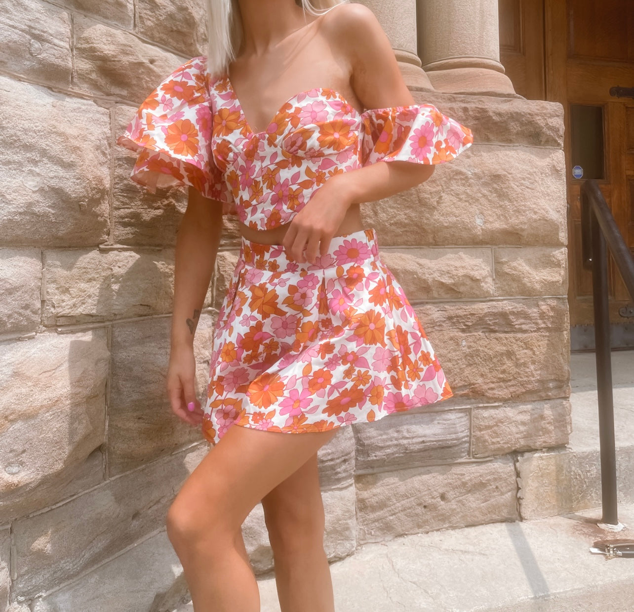 Our Malibu Sunset features a cup outlining corset top with ruffled off the shoulder sleeves.