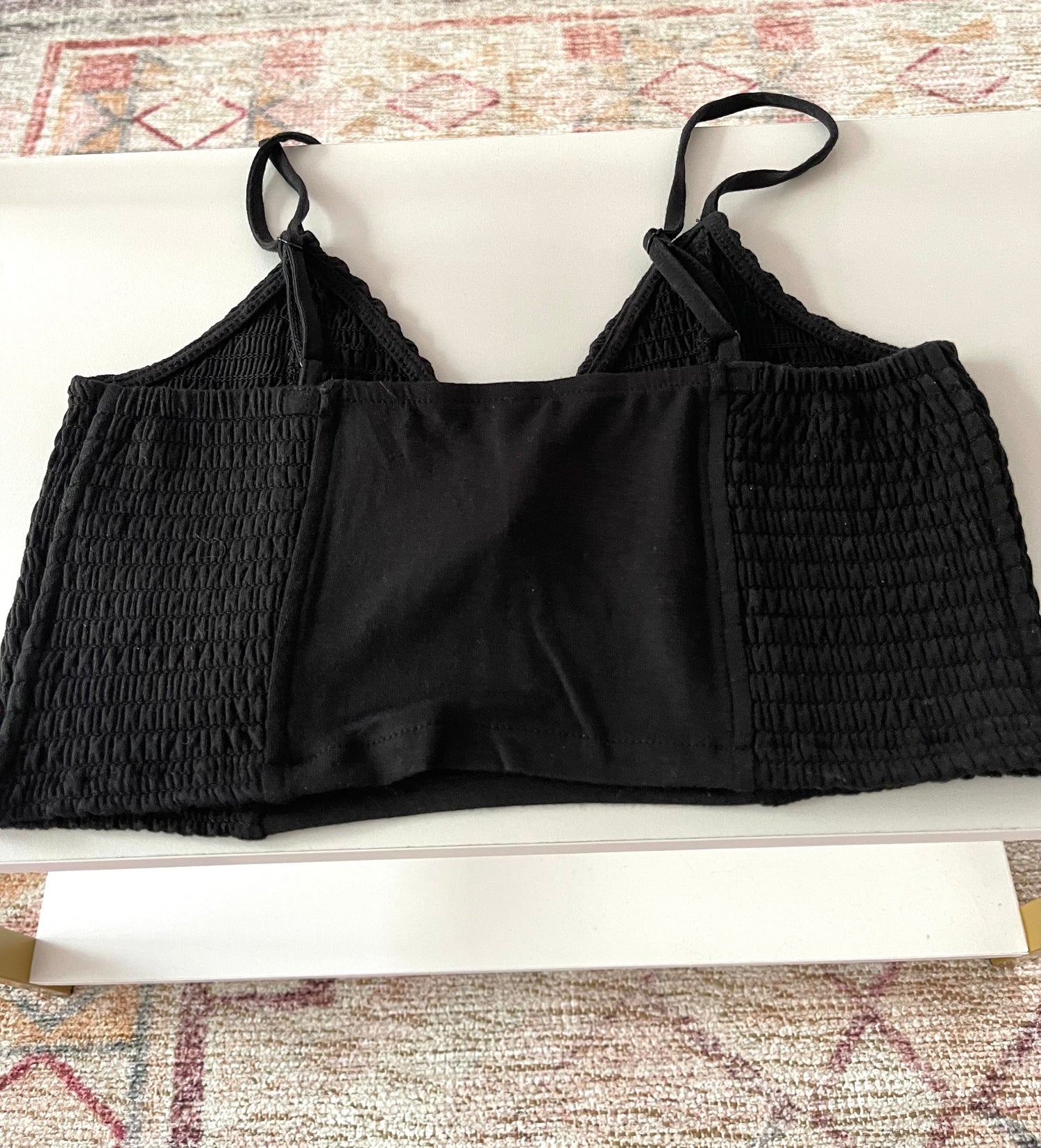 Our Sydni features a soft & stretchy ribbed material with a v-neck cup outlined stitching with adjustable straps.
